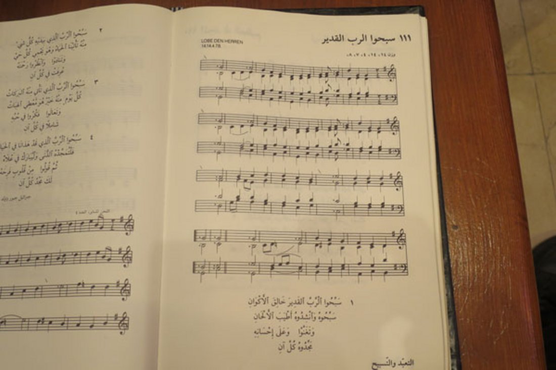 Im lutherischen Gottesdienst der palästinensischen Christen waren wir zu Gast und eingeladen, mit zu singen und mit zu beten. Liedanzeigetafeln gab es nicht, die hätten wir auch gar nicht entziffern können – ist eben eine andere Sprache mit eigenen Zeichen. Und dann schlagen sie das Buch von hinten auf, schreiben und lesen von rechts nach links …. und so schreiben sie auch die Noten! (siehe Foto). Es ist schon eine verkehrte, verdrehte Welt – erst recht, wenn dann die Mitglieder der Gemeinde aus ihrem Leben erzählen: In ihren Gebieten gibt es wenig Arbeit, darum arbeiten etliche in Jerusalem (nur 9 km entfernt), und müssen jeden Tag den Checkpoint passieren. Diese Checkpoints sind hochabgesicherte Durchgänge in der langen Grenzen zur Westbank – oft mit einer 5 - 6 Meter hohen Betonmauer. Und wenn diese Mauer die Menschen dann auch von ihren Olivenhainen trennt, können Existenzen vernichtet werden.