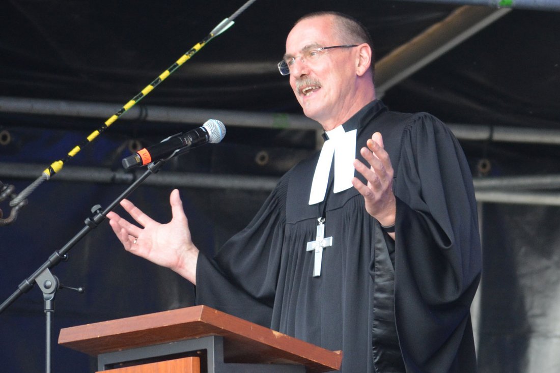 Propst Matthias Krüger predigte. „Liebe ist immer auch fröhliche Arbeit. Manchmal fällt sie vom Himmel. Manchmal direkt ins Herz. Aber sie zu bewahren, zu erneuern, zu gestalten, das ist Arbeit und Aufgabe“, sagte er. „Und immer geht es darum, Verantwortung zu übernehmen in der Gesellschaft. Für ein respektvolles Miteinander. In Deutschland und der Welt. Und völlig egal, wie oder was ich bin, wie ich gelesen werden möchte, wie oder wen ich liebe. Der Respekt gilt allen!“ Charlotte Ipsen von der Neuapostolischen Gemeinde hatte einen Poetry-Slam-Text zum Motto des Gottesdienstes verfasst, den sie vortrug. Nichts im Leben breche einen so wie der Hass, die Kälte dieser Welt, sagte sie. „Liebe den Nächsten wie dich selbst und Gott über alles. Lebe mit Zuversicht.“ So lautete eine ihrer Botschaften.