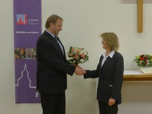 Der Vorsitzende des Kirchengemeinderats, Pastor Rainer Karstens, lud am Mittwoch, dem 6.1.2016, im Anschluss an den Gottesdienst zum Epiphanias-Empfang in der St. Marien-Kirche in Rendsburg. Vor rund 100 Gästen überreichte er Ilona Pinkenburg das Ansgarkreuz für ihr ehrenamtliches Engagement in der Kirchengemeinde. Pinkenburg setzt sich seit vielen Jahren vor allem für die Vernetzung kirchlicher Arbeit über gemeindliche und institutionelle Grenzen hinweg ein. Dafür macht sie sich im Kirchengemeinderat und im Kooperationsausschuss der vier Gemeinden in der Region Rendsburg-Büdelsdorf für eine verstärkte Zusammenarbeit stark. Der Erfolg kann sich sehen lassen: Die drei Rendsburger Kirchengemeinden geben mittlerweile einen gemeinsamen Gemeindebrief unter dem Titel „Klinke“ heraus und in der Neuauflage einer Hochzeitsbroschüre für Rendsburg und Büdelsdorf treten alle evangelischen und katholischen Gemeinden gemeinsam auf.