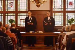Bürgermeister Pierre Gilgenast bedankte sich bei Bischof Gothart Magaard für sein Kommen und erklärte: „Bibel findet Stadt und findet hier auch öffentlich statt. In exakt diesem Raum wurde vor 474 Jahren die Reformation in Schleswig-Holstein eingeführt“. Die Pröpste hießen die Vertreter der Kirchengemeinden willkommen: „Heute reichen wir die Bibel an Sie und Euch weiter“, so Propst Matthias Krüger. Propst Sönke Funck ergänzte: „Und das tun wir handgreiflich, also anfassbar und tatsächlich. Dazu ist es schön, dass unser Bischof auch da sein, dabei sein kann! Willkommen Bischof Magaard – quasi mit der Gabe unserer Nordkirche im Gepäck, um sie weiterzugeben, die neu revidierte Lutherbibel“.