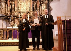 In seiner Laudatio beim Empfang beschrieb Propst Matthias Krüger die wertvolle Mitarbeit im Kirchenkreisrat, dessen Vorsitzender er ist: „Kirchenkreisratssitzung, Tagesordnungspunkt 5. Klare Sache, gut vorbereitet, sollte glatt durchgehen, maximal vier Minuten – denke ich. Dann meldet sich Frau Eggert. Ob sich der Satz unter 3. in der Beschlussvorlage nicht beißen könnte mit dem, was im 5. Absatz in der Erläuterung ausgeführt ist? Das könne man eventuell beheben, wenn man Satz 1 umformulierte. Die Diskussion nimmt ihren Lauf und meine Zeitplanung für die Sitzung ist dahin. Mit anderen Worten: Insea Eggert ist immer gut vorbereitet und verfügt über einen hellen und kritischen Geist und wenn dann eine gute Prise Humor dazukommt – dann kann es für alle nur gewinnbringend sein.“ So ist es auch in der Urkunde zur Medaille ausgeführt: „In ihrer engagierten und kritischen Art ist Insea Eggert ein fachlich versiertes und überaus verlässliches Gegenüber, ein Mensch, dem Vertrauen entgegengebracht werden kann und wird. Gerade auch als Juristin verfügt sie über die Fähigkeit, komplexe Zusammenhänge zu durchdringen und zu hinterfragen, was sie auch tut.“