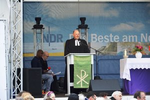 Gottesdienst mal anders, nämlich Open Air und auf Plattdeutsch konnten die Rendsburger am Sonntag, dem 29.5.2016 auf dem Paradeplatz erleben. Anlass war das Landpartie-Fest des NDR und prominente Unterstützung hatte Pastor Lars Klehn auf der Bühne auch: Yared Dibaba las in lupenreinem Platt. Der ursprünglich aus Äthiopien stammende Dibaba lernte nach seiner Flucht nach Deutschland neben der deutschen Sprache auch den plattdeutschen Dialekt und ist so für manch einen (Nord-)deutschen eine kleine Überraschung.