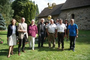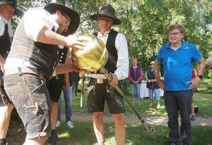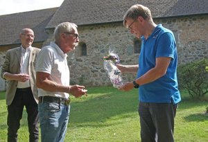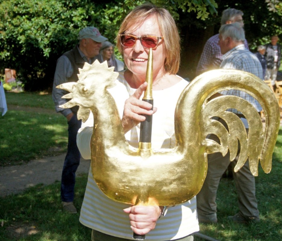 Kosel – So schnell wird man diesen Goldenen Hahn nicht mehr aus der Nähe betrachten können. Schon deswegen sind viele der Einladung der Kirchengemeinde Kosel auf den Friedhof neben der St. Laurentius Kirche gefolgt. Der Goldene Hahn soll für die Montage auf der Kirche vorbereitet, die Golde Kugel unter seinen „Krallen“ mit Dokumenten gefüllt werden. Der Kirchengemeinderat ist vertreten, Propst Matthias Krüger für den Kirchenkreis, Bürgermeister Hartmut Keinberger, interessierte Bürger der Gemeinde und natürlich die Handwerker. Als besonderer Gast vor Ort ist Dr. Johann Wadephul. Der CDU-Wahlkreisabgeordnete im Bundestag hat sich maßgeblich dafür eingesetzt, dass die Kirchengemeinde Kosel eine Unterstützung in Höhe von 250.000 Euro für ihre Baumaßnahmen an Kirchturm und Kirchenschiff erhält.
