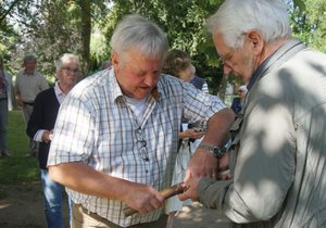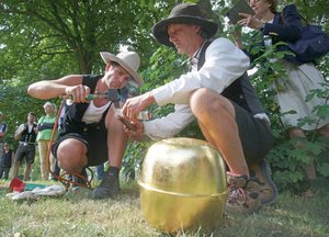 Architekt Dietrich Fröhler schreitet nach den kurzen Grußworten zur Tat. Er soll die Kapsel für die goldene Kugel füllen. Sie ist klein, die kopierten Dokumente aus drei vorherigen Bauperioden, die in der Kapsel gefunden wurden, sind wieder mit dabei. Und Fröhler steckt gemeinsam mit Heinz Meggers aktuelle Informationen auf Papier und USB-Stick über das Bauprojekt und die Beteiligten hinein. Dann wird die Kapsel verschlossen, in die Kugel gesteckt und wasserdicht verschlossen. Kurz darauf sitzt auch der Hahn wieder über der Kugel. Noch aber am Boden neben der Kirche, auf den Turm kann er erst am folgenden Tag montiert werden.