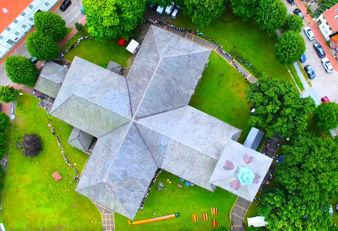 Zum Orgelnachspiel zog die Gemeinde aus, um ihre Kirche zu umarmen. Zwei lange Menschenketten starteten in beide Richtungen um die Kirche - die Freude war groß, als diese sich wieder trafen und die Aktion gelang. Danach gab es ein fröhliches Miteinander auf dem Rasen rund um die Christkirche. Viele beteiligten sich an dem Programm: Das Diakonische Werk des Kirchenkreises Rendsburg-Eckernförde, das Jüdische Museum, die Volkshochschule, der Weltladen, die Theaterfreunde, die Jugendkirche Rendsburg und Umgebung, das Team des Gemeinde-entwicklungsprozesses und der Förderverein zur Erhaltung der Christkirche. Für die Kleinen gab es Spielangebote, für die Ohren Musik vom Posaunenchor und ein Mitmachkonzert von Finn Böhme und Frederik Kleinschmidt, das wegen des guten Wetters kurzerhand nach draußen verlegt wurde. Die Rendsburger Musikschule gab ein Konzert in der Christkirche und rundete damit das Programm ab. Viele helfende Hände sorgten für das leibliche Wohl. Das Festgelände war mit den Fahnen der katholischen Gemeinde geschmückt. Das zeigte auch an diesem Tag das gute ökumenische Miteinander in Rendsburg.