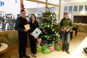 Eine weitere schöne Bescherung für die Kindertafel hielt das Fitnessstudio „4 fun fitness“ in Büdelsdorf bereit: Viele bunte Weihnachtspäckchen für die Kinder konnte der Koordinator der Rendsburger Tafel, Volker Siegling, dort in Empfang nehmen. Im Vorraum des Fitnesstudios stand seit Ende November ein festlich geschmückter Weihnachtsbaum, unter dem die Kunden die Geschenkpäckchen ablegen konnten. Ergänzt wurde diese schöne Aktion mit einer gut gefüllten Kiste voller frischem Obst und Gemüse, die von den Mitarbeitern des Fitnessstudios gespendet wurde.