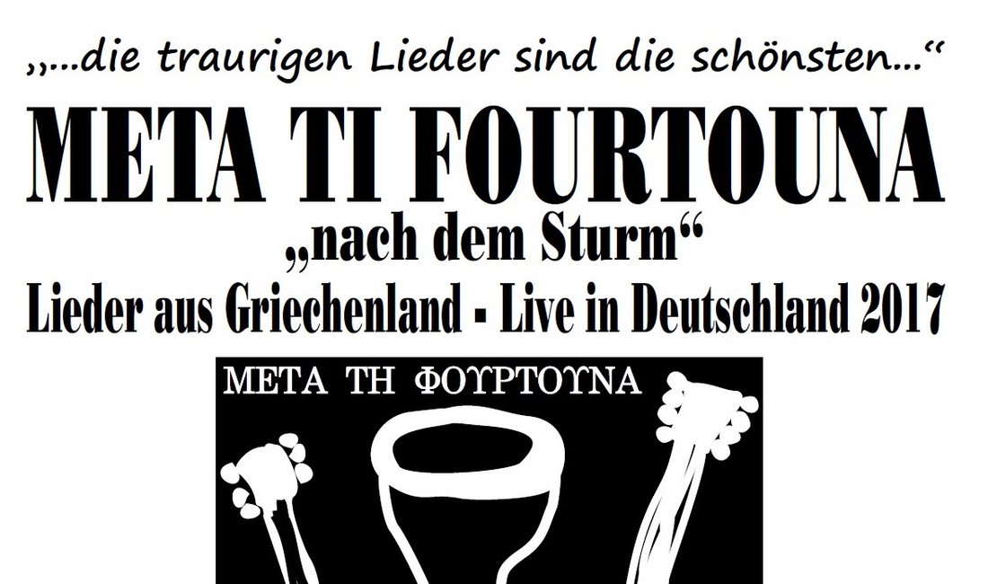 Am Sonntag, 14. Mai 2017, (Beginn: 17:00 Uhr, Kantoreisaal der Christkirche, Prinzenstraße 13) lädt die Christkirchengemeinde zu einem besonderen Konzert ein. Zu Gast sind das griechische Trio „Meta ti Fourtouna“ und das Duo „Lejonbruden“. Zu hören sein wird ein buntes Programm von traditionellen Tänzen über Lieder von Mikis Theodorakis bis hin zu skandinavischen Folk-Songs der Gegenwart. Entsprechend vielfältig sind auch die Instrumente, die Christina Metzika, Maria Stavrianoudaki und Alexander Spitzning, die gemeinsam „Meta ti Fourtouna“ (deutsch: „nach dem Sturm“) bilden, spielen: traditionelle Schlaginstrumente, Bouzouki und griechische Laute verbinden sich zu Klängen, die Melancholie und Lebensfreude verbinden.