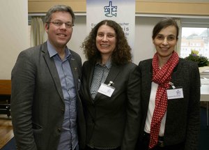 Die neuen Synodalen wählten auch die beiden Stellvertreter. Christian Bingel (38), Pastor in Owschlag, erhielt aus der Gruppe der Pastorinnen und Pastoren die meisten Stimmen. Zweite Vizepräses ist die ehrenamtliche Synodale Susanne Ohm-Becker (51) aus der Kirchengemeinde Fockbek. Gemeinsam mit Maike Tesch nahmen sie nach ihrer Wahl den Platz am Kopf der neuen Synode ein und leiteten mit Unterstützung von Propst Sönke Funck die weiteren Wahlen der konstituierenden Sitzung.