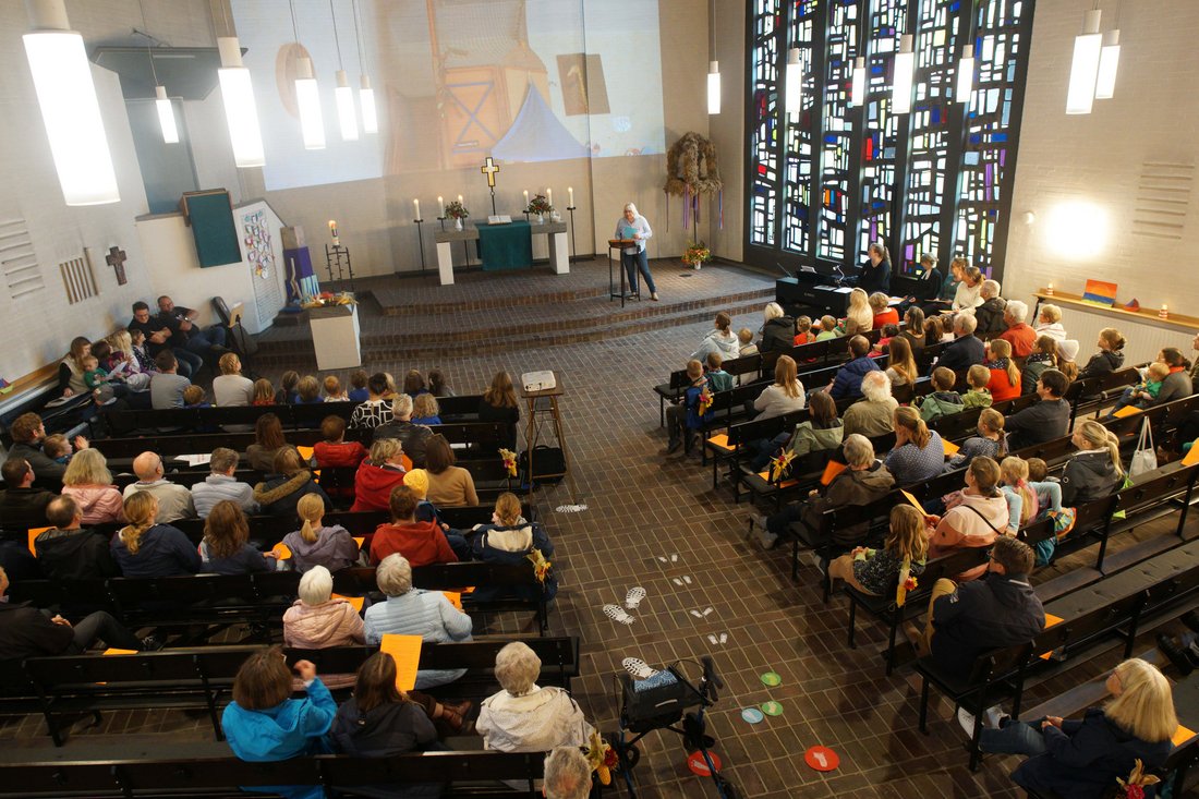 Der Gottesdienst zum Jubiläum der Kita war erfüllt von großer Dankbarkeit. Dankbarkeit für die Arbeit der Erzieherinnen und Erzieher in der langen Geschichte der Einrichtung und das heutige Team. Kita-Leiterin Konstanze Nahrstedt-Kauper bat alle Kolleginnen und Kollegen nach vorne, um ihnen ein persönliches Geschenk zu überreichen und Danke zu sagen. Die Gemeinde im Gottesdienst applaudierte.