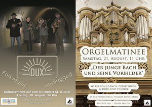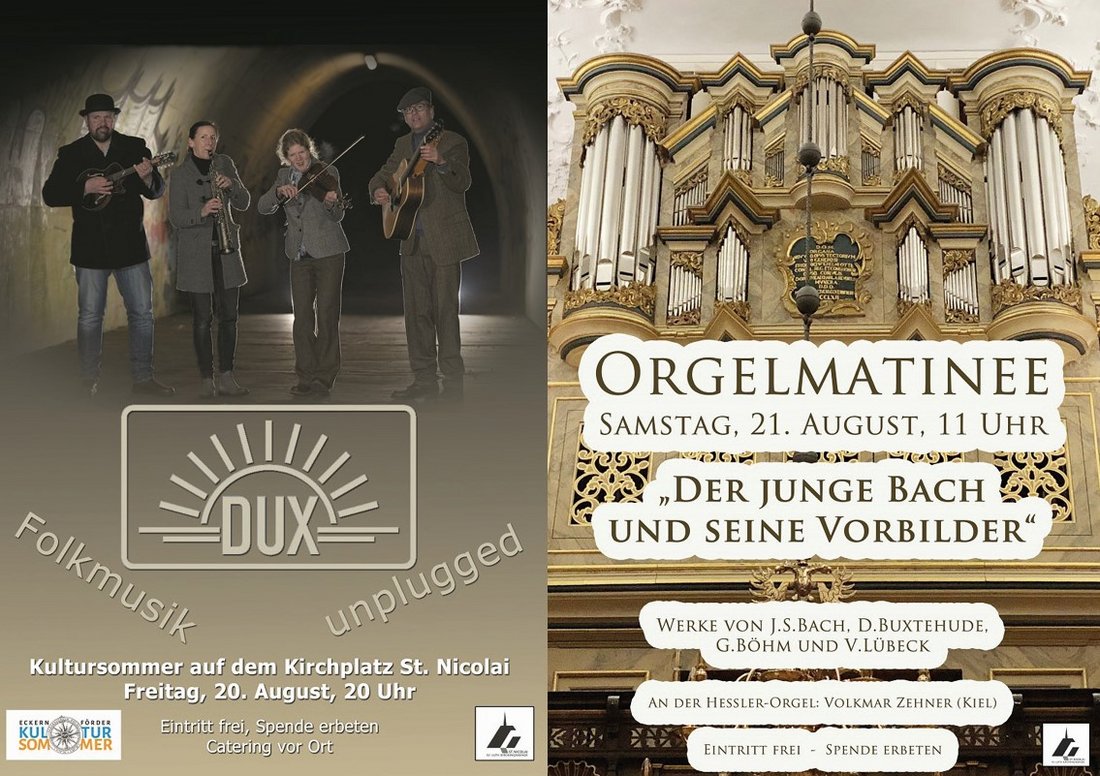 Am kommenden Freitag, 20. August um 20.00 Uhr kann man auf dem Kirchplatz vor der St. Nicolai-Kirche „Folkmusik unplugged“ mit dem Quartett Dux erleben. Das Quartett DUX spielt stimmungsvolle und schmissige Lieder und Melodien zum Wippen, Schwelgen, Träumen und Genießen. Musik mit Patina und PS, Synkopen und Drive, angereichert mit Witz und Laune. Kerstin Lorenzen (Akkordeon, Saxofon, Whistles und Gesang) Roland Lorenzen (Tenorgitarre, Mandoline, Kalimba und Gesang) Verena Pieper (Fiddle und Gesang) Nils Pieper (Gitarre, Gesang) präsentieren ihre selbstentworfenen Kompositionen und Improvisationen der Folkmusik. Kulinarisches ist wie immer vor Ort zu erwerben.