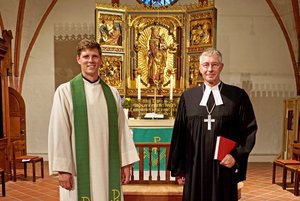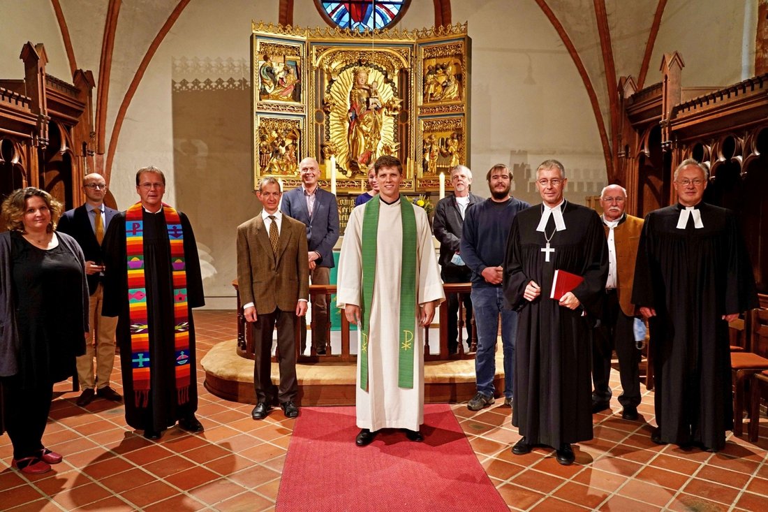 Propst Sönke Funck ging in seiner Ansprache auf Gottes Heilsversprechen aber auch auf die Rolle des Pastors ein. „Der Herr lässt sein Heil verkündigen; vor den Völkern macht er seine Gerechtigkeit offenbar“, zitierte er die Tageslosung des Sonntags aus Psalm 98. „Gottes Gerechtigkeit offenbaren, das macht unser Gott schon selbst und hat es getan in seinem Sohn Jesus Christus – das dürfen wir getrost auch ihm überlassen“, sagte Funck. Allerdings müsse es jemanden geben, der das Heil verkündige. „Das geschieht nicht nur von Gott, nicht von allein, dazu braucht auch es uns, die Christinnen und Christen, im allgemeinen Priestertum aller Getauften, wie es Martin Luther gesagt hat.“