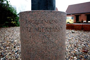 Die letzten beiden Jahre bis zu seinem Tod 2012 verbrachte er schließlich in der Wohngemeinschaft „Lichtblick“ der Pflege LebensNah im Rendsburger Stadtteil Parksiedlung. Seinen Besitz vererbte er der Einrichtung. „Die Stele soll dazu beitragen, dass sein Schicksal nicht vergessen wird“, sagt Brigitte Voss von der Alzheimer-Beratung der Pflege LebensNah. Geplant sei, im Fritz-Niemand-Haus noch eine Tafel mit der Vita des Namensgebers anzubringen, da viele Angehörige mit diesem nichts anfangen könnten. Die Stele hat der Bildhauer Manfred Sihle-Wissel angefertigt. Sie stellt einen alten griechischen Hirtenstab dar, den sogenannten Taustab, weil er aussieht wie das griechische Tau. Noch heute werden Taustäbe von einigen orthodoxen Bischöfen verwendet.