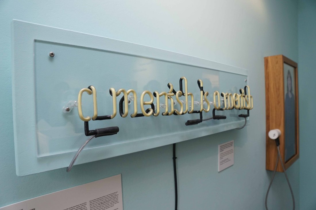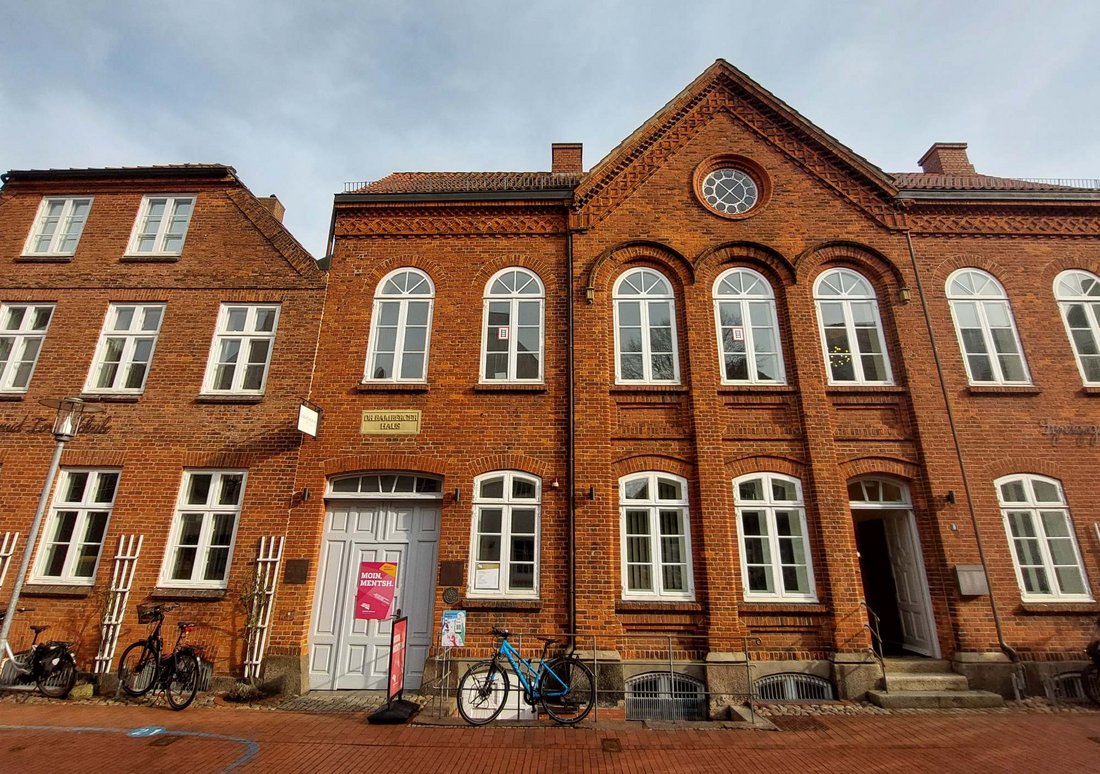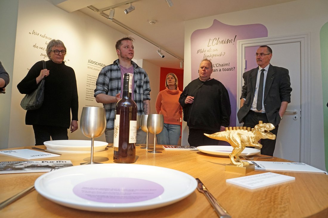 Nach einer kurzen Andacht ging es in geführten Gruppen durch die Ausstellung „400 Jahre Gegenwart! Jüdisches Leben in Schleswig-Holstein“. Zunächst führte der Weg die eine Gruppe aber nach Draußen auf die gegenüberliegende Straßenseite des Museums. Leiter Jonas Kuhn informierte über die Geschichte des Gebäudes. Zum Gebäudeensemble des ehemaligen Gemeindezentrums der Jüdischen Gemeinde Rendsburg gehören die Talmud-Tora-Schule von 1830 sowie die Synagoge. Sie ist im Jahre 1844/45 erbaut worden. „Was fällt Ihnen an dem Gebäude auf?“, fragte Kuhn die Gruppe. Zwei Eingänge, der Zugang zum Keller, die nach oben hin abgerundeten Fenster waren Antworten. Worauf Kuhn hinaus wollte, war die Unscheinbarkeit des Ensembles. Es fügt sich unauffällig ein in die Häuserreihen an der Prinzessinstraße. Kuhn erklärte dies damit, dass die Synagoge in einer Zeit gebaut wurde, in der die Religionsausübung erlaubt war, aber möglichst unauffällig stattfinden sollte. Rund 300 Mitglieder gehörten damals zu der Gemeinde. Als jüdische Menschen Mitte des 19. Jahrhunderts anderen Bürgern rechtlich und politisch weitgehend gleichgestellt wurden, zog es viele Gemeindemitglieder in größere Städte. Dadurch wurde die Gemeinde in Rendsburg kleiner. 1933 lebten nur noch 30 Gemeindemitglieder in der Stadt. 1938 während der Novemberpogrome schändeten SA-Männer die Synagoge. Mit einem Sprengstoffanschlag zerstörten die den Toraschrein. Im selben Jahr wurde die Synagoge im Zuge der „Arisierung“ verkauft. Kuhn berichtete, dass der Raum jahrzehntelang als Fischräucherei genutzt wurde. 1988 zog das Jüdische Museum in die Räume ein.