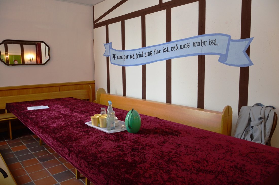 Durch einen schmalen Gang mit Wahlwerbeplakaten für Martin Luther, gestaltet von Konfirmand_innen, kommt der Besucher auf den Marktplatz, eine große Fläche, die für Begegnungen frei gehalten wurde. Von dort können die übrigen Stationen des Parcours erreicht werden: Eine Disputierkanzel, von der nach alter Tradition aus Luthers Zeit Themen kritisch behandelt werden können; Cranachs Malschule, in der die alte Kopiertechnik gezeigt wird, aber auch Kinder Lutherrosen ausmalen können; Die Schlosskirche mit einer Thesentür, an der eigene Thesen angeschlagen werden können und sollen; Die Wartburg, stilecht mit einem Teufel und einem Tintenklecks an der Wand und der Möglichkeit, an der „Büdelsdorfer Bibel“ mitzuschreiben; Käthes Stube, in der Tischreden gehalten und über das Erlebte sinniert werden kann.