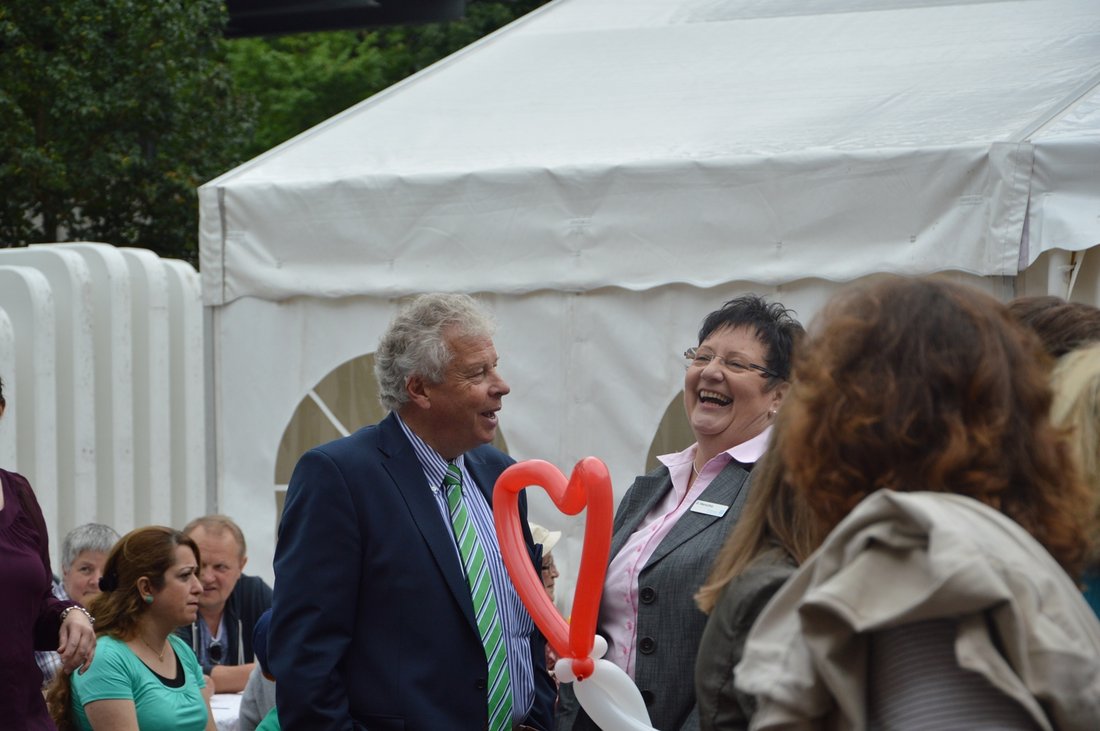 Nach dem offiziellen Teil ging es auf Entdeckungstour: Mitarbeiterinnen und Mitarbeiter führten interessierte Besucher durch alle Stockwerke. In einzelnen Räumen stellten sich die unterschiedlichen Arbeitsbereiche vor, an den Wänden hingen Bilder von Schülern des Offenen Ganztags-Angebots zum Thema „Was ich mir für die Welt wünsche“. Während sich die Erwachsenen über die neuen Möglichkeiten der Einrichtung informierten, konnten sich die Kinder schminken lassen oder sich am Bälle-Vulkan und beim Bogenschießen austoben. Zur Stärkung standen Kaffee, Kuchen und Köstlichkeiten vom Grill bereit. An einem solchen Tag ließ sich keiner der buntgemischten Gästeschar aus Klienten, Kunden, Mitarbeitenden und deren Familien die Freude von kurzen Regenschauern verderben.