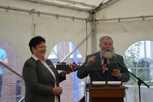 Einer guten alten Tradition folgend überreichte Heiko Naß, der Landespastor des Diakonischen Werks Schleswig-Holstein, Diana Marschke Brot und Salz, Lothar Möhding überreichte eine Silhouette der Stadt Rendsburg – samt Hochbrücke und Schwebefähre. Genauso wie Hochbrücke und Schwebefähre beide Seiten des Nord-Ostsee-Kanals verbindet, verbinde die Diakonie Stadt und Landkreis miteinander, erklärte er.