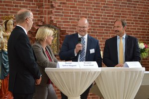 Schleswig-Holsteins Sozialministerin Kristin Alheit, Gothart Magaard, Bischof im Sprengel Schleswig und Holstein, sowie Rendsburgs Bürgermeister Pierre Gilgenast gaben Antwort. In einer Talkrunde, moderiert von Pastor Lars Klehn, ging es um Vereinbarkeit von Familie und Beruf, heutige Erwartungen an Familien und um gesellschaftliche Werte. Kristin Alheit sprach sich für eine Veränderung der Arbeitswelt aus. Nur so könnten Frauen und Männer mit Kindern Familie und Beruf unter einen Hut bekommen. Die Kirche sieht sie als „Erweiterung von Familie“. Sie könne Kindern einen Raum geben, sich auszuprobieren und sich gleichzeitig behütet zu fühlen. Bischof Gothart Magaard wünschte sich für Familien gute Rahmenbedingungen, damit ein gutes Miteinander für Familien möglich sei. „Es ist wichtig, sich in den Blick zu nehmen und generationsübergreifend füreinander einzustehen.“ Er wies auf den Schutz des Sonntages hin. „Den Sonntag brauchen wir für die Familie.“ Eine fortschreitende Ökonomisierung dieses Tages dürfte nicht hingenommen werden. Bürgermeister Pierre Gilgenast bedankte sich bei der FBS für die Unterstützung. Die hohe Kinderarmut in der Stadt und auch die Integration der Flüchtlinge seien Herausforderungen, bei der Partner wichtig seien. „Wir brauchen euch mit eurer Arbeit in Rendsburg.“