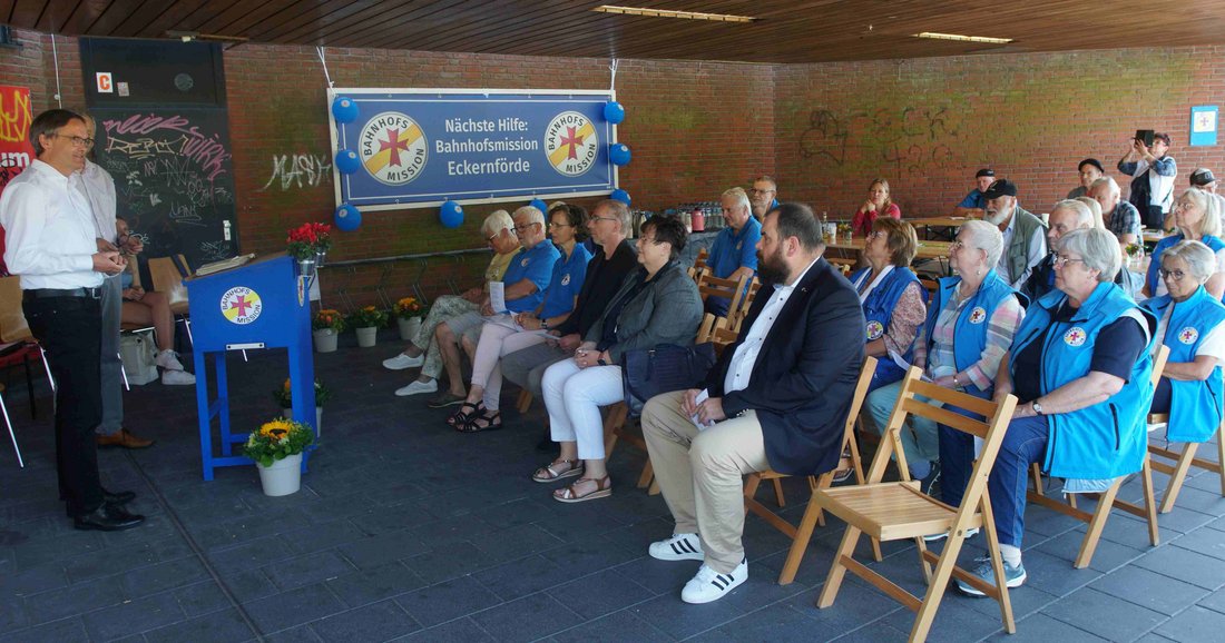 Pastor Michael Jordan von der Kirchengemeinde St. Nicolai feierte gemeinsam mit Robert Klimek von der katholischen Pfarrei St. Ansgar die Andacht, denn die Bahnhofsmission in Eckernförde ist eine ökumenische Einrichtung. Michael Jordan dankte den Ehrenamtlichen und stellte ihren Einsatz als Beispiel für gelebten Glauben dar. „Wie gut ist es, dass es Euch gibt!“ Und die Geschäftsführerin des Diakonischen Werks des Kirchenkreises Rendsburg-Eckernförde gGmbH Diana Marschke ergänzte: „75 Jahre Bahnhofsmission das sind 75 Jahre gelebte Solidarität am Bahnhof.“ Sie habe eine Hochachtung für den Einsatz vor Ort. Für die Stadt bedankte sich der zweite stellvertretende Bürgermeister Lars Vondenhoff bei der Bahnhofsmission. „Sie sind durch eine App nicht zu ersetzen, der menschliche Kontakt ist wichtig. Sie kümmern sich um die Vergessenen.“