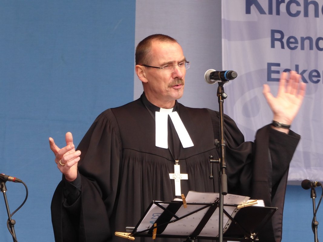Der Künstler Christo habe die Menschen „ins Gehen bringen“ wollen, zitierte Krüger und er nahm dies in seiner Predigt immer wieder auf. So wie Petrus die Grenzen überschritten habe und über sich hinaus gewachsen sei, so müssten auch wir in der heutigen Zeit gehen und Grenzen überschreiten. Denn: „Wo kämen wir denn hin, wenn niemand ginge und sagte: So nicht. Wenn alle wegguckten. Wenn niemand sagte: Du Mensch, du Ebenbild Gottes.“ Krüger rief dazu auf, gemeinsam zu gehen. „Christus reicht uns die Hand. Sein Wort trägt. Fürchtet euch nicht.“