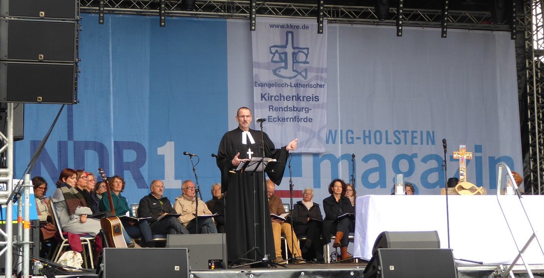 Der Gottesdienst auf der NDR-Bühne im Kreishafen Rendsburg wurde begleitet vom St. Nicolai Chor, Eckernförde unter der Leitung von Kirchenmusikdirektorin Katja Kanowski. Bei trockenem Wetter stand für einen Moment ein Regenbogen am Himmel.