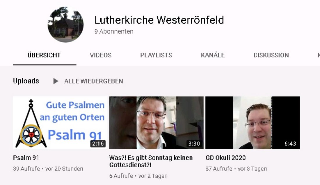 Und Pastor Rode Zimmermann-Stock hat einen Youtube-Kanal für seine Kirchengemeinde Westerrönfeld eingerichtet und sendet dort Kurz-Andachten aus der Kirche. Er ist auch über WhatsApp erreichbar (0171-730 31 42).