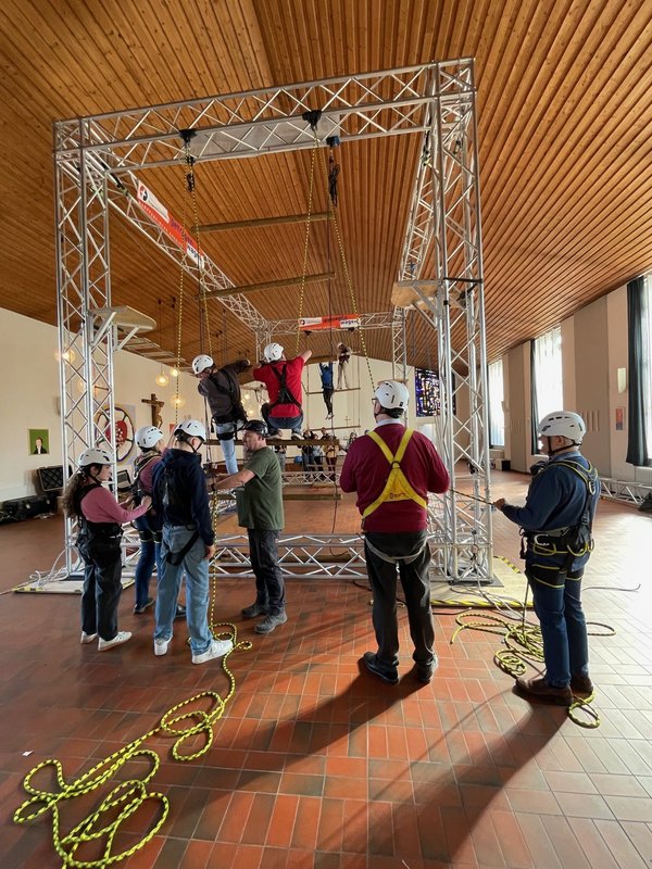 Zwei Tage lang haben der Köthener Pfarrer Martin Olejnicki und Jugendreferent Uwe Kretschmann den mobilen Hochseilgarten aufgebaut. Die Höhe musste angepasst werden, die Kirche ist „nur“ sechs Meter hoch, die eigentliche Höhe des Parcours beträgt aber acht Meter. So war die Laufhöhe bei ungefähr dreieinhalb Metern. Darauf folgte die zertifizierte Ausbildung der Teamerinnen und Teamer, die das Projekt begleiteten. Denn ohne Basiswissen über alles rund ums Klettern ging hier niemand in die luftige Höhe. Gruppen und Einzelpersonen sind geklettert, zwei Gottesdienste wurden mit dem Parcours in der Mitte der Kirche gefeiert.