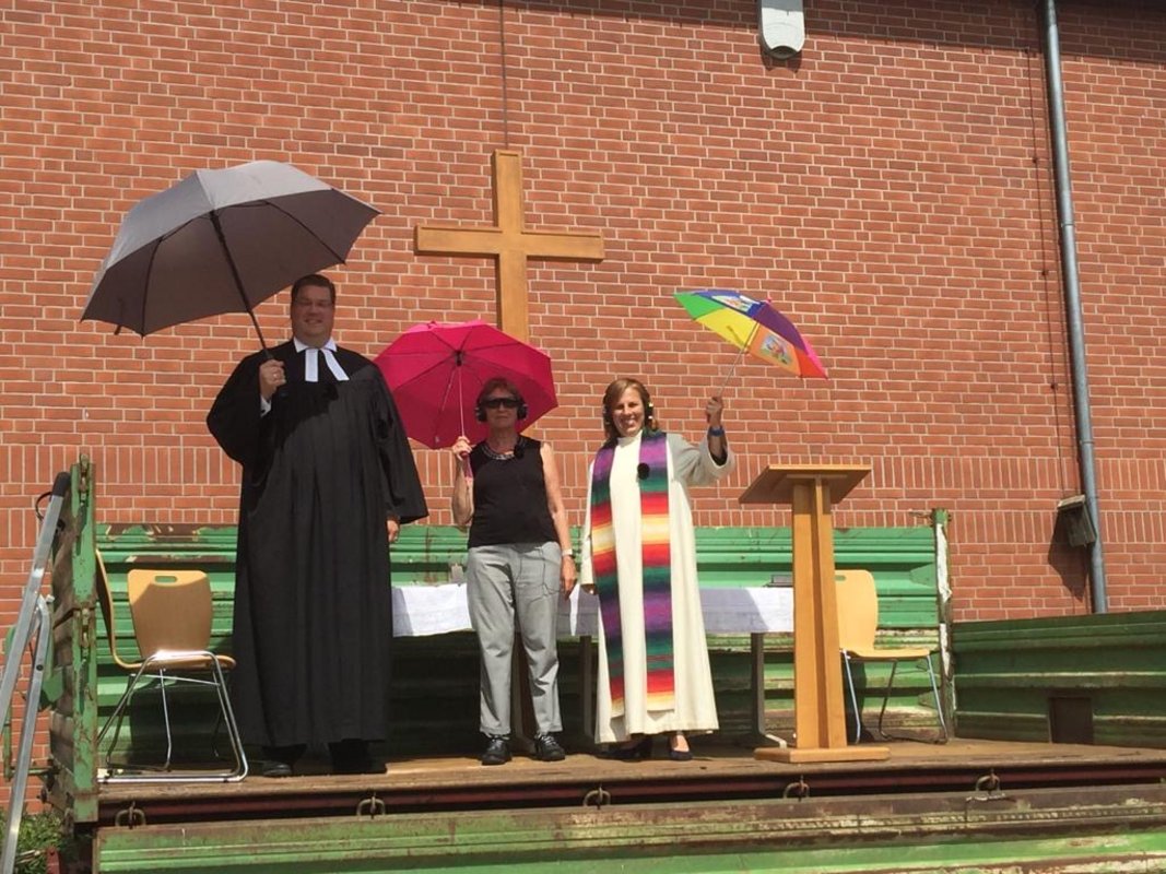 Rendsburg/Westerrönfeld – Der zweite Kopfhörergottesdienst auf dem Parkplatz der Heidsandhalle in Westerrönfeld war wieder gut besucht: 75 Menschen war da, in 8 Autos bzw. auf Stühlen. Zu Beginn brauchten die Menschen gar Sonnenschirme, weil es so heiß war.
