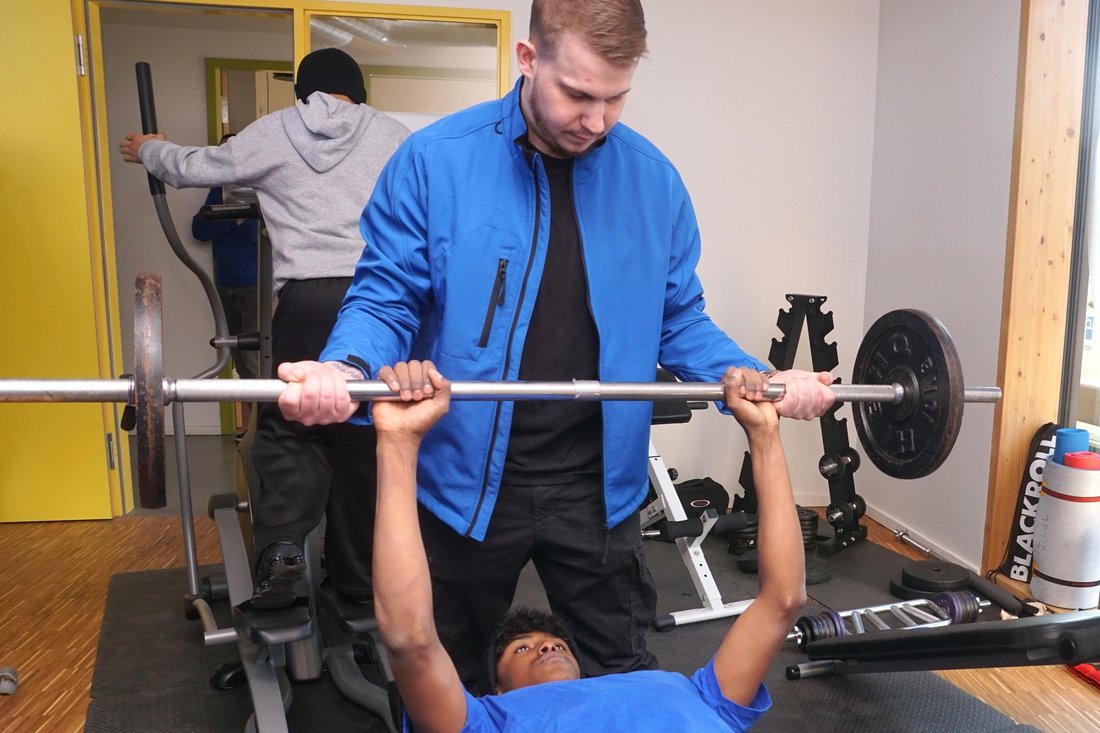 Nun also können Fuad Al-Makdani und die anderen Jugendlichen in Mastbrook trainieren, ohne dafür etwas bezahlen zu müssen. Die Offene Jugendarbeit ist kostenlos, alle sind willkommen, das Angebot soll so niedrigschwellig wie möglich sein. Und so steht nun Danny Heitmann neben Al-Makdani und hilft beim Training. Der 26-jährige Erzieher ist ein erfahrener Kraftsportler und sorgt dafür, dass die neuen Geräte richtig genutzt werden. „Ich kontrolliere das Training genau“, sagt er. „Wichtig ist, dass nicht zu viel Gewicht gestemmt wird.“ Die Jugendlichen sollen schließlich Spaß haben, sich sportlich betätigen und sich dabei keinesfalls verletzen. Heitmann hat seine Kolleginnen und Kollegen eingewiesen, damit diese ebenfalls helfen können. Schließlich ist Heitmann Standortverantwortlicher im Jugendtreff Europaforum an der Altstadtschule.