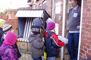 „Aber die ist sehr teuer“, hat ihnen Angela Löhrke, Leiterin der Kita erklärt. Also sind die Kinder kreativ geworden. „Wir könnten doch Kekse verkaufen“, sagten sie. Gebrauchtes Spielzeug wollten sie auch verkaufen, um Geld zu sammeln. Gemeinsam mit den Erzieherinnen der Kita überlegten die Kinder, wie genau sie Spenden sammeln könnten. Da entstand auch die Idee, von Haustür zu Haustür zu ziehen und zu singen. Damit überrascht wurde unter anderem Holger Janzen. „Aus der Pusteblume kommen wird. Sammeln Spenden, darum singen wir hier“ sangen die Kinder vor seiner Haustür. Gerne unterstützte der Osdorfer ihr Projekt und übergab den Kindern eine Spende. Als Dank erhielt er einen selbst gebastelten Stern.