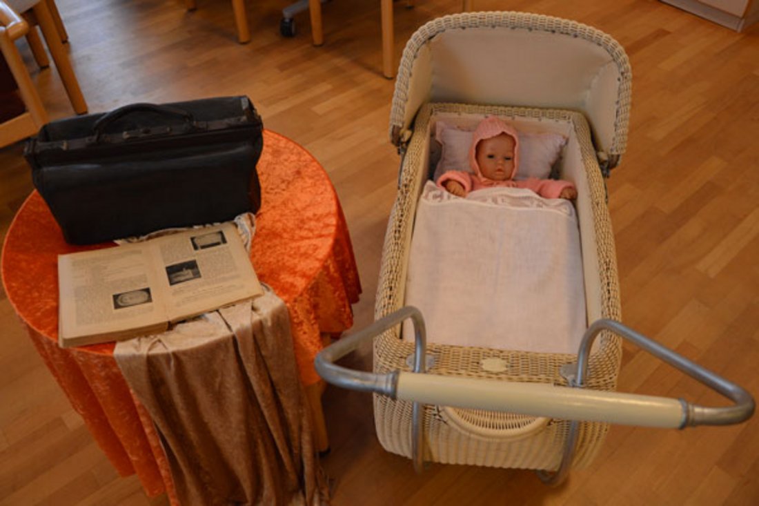 Rendsburg „Erzählen Sie doch mal, wie es war als Sie in den 50er Jahren entbunden haben fragt Hebamme Synje Frenzel-Rathje die 92-jährige Elsa Vehrs. Frau Vehrs sitzt in einem Raum der Ev. Familienbildungsstätte, der mit nostalgischen Relikten aus den verschiedenen Jahrzenten des letzten Jahrhunderts geschmückt ist. Dazu gehören neben einer Wäscheleine mit verschiedenen Babykleidern, die über der Spieleckecke hängen, Fotos von Müttern und Kindern in Bilderrahmen und nicht zuletzt ein Schmuckstück aus den 50er Jahren, ein alter Kinderwagen sowie Utensilien einer Hebamme aus vergangen Zeiten wie der bekannte Hebammenkoffer und das Hörrohr zur Untersuchung der Herztöne. Frau Fehrs erzählt von ihren beiden Kindern, die heute 63 und 60 Jahre alt sind. Sie musste sich in der ersten Schwangerschaft ein Vierteljahr übergeben und habe nie einen Arzt gesehen. Die Hebamme kam vorbei und hörte mit einem Hörrohr die Herztöne des Kindes ab. „Sie war ganz fortschrittlich“, meinte sie zu diesem Vorgang. Else Vehrs hatte damals keine Angst vor der Geburt, es war das natürlichste von der Welt. Ihr Mann hatte damals beim ersten Kind die Hebamme geholt und dann ging alles ganz schnell, sagt sie. Gestillt habe sie damals nicht, aber das Kind bekam Buttermilch, worunter später Haferflocken gemischt wurden und der Brei anschließend mit der Flasche verabreicht wurde.