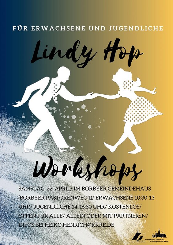 Wer sich vorbereiten möchte, kann am Samstag, 22. April, zum Lindy-Hop-Workshop ins Gemeindehaus, Borbyer Pastorenweg 1, für Erwachsene von 10.30 bis 13 Uhr und für Jugendliche und junge Erwachsene von 14 bis 16.30 Uhr kommen. Getanzt wird im Wesentlichen zu zweit, einen festen Partner braucht es nicht. Wir wechseln untereinander ab. Wer als Paar zusammenbleiben möchte, kann das aber auch tun.