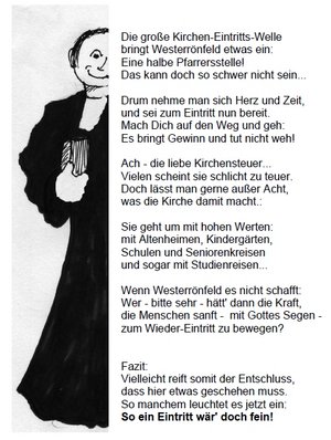 „Kirche sucht…“ liest man zurzeit ja überall. Meist geht es dann um die Kandidaten für die Kirchengemeinderats-Wahlen am 1. Advent. Westerrönfeld aber geht noch einen Schritt weiter: Der Kirchengemeinderat dort sucht dringend Kirchenmitglieder, also Menschen, die (wieder-)eintreten wollen in die Kirche.