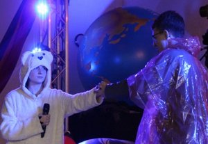 Gestaltet wurde diese Andacht durch die Ehrenamtlichen der Jugendarbeit unseres Kirchenkreises. Eindrucksvoll war schon zu Beginn das heftige Rauschen zahlreicher „Rainsticks“, die akustisch die Klimaveränderungen in der Arktis deutlich machten. Ein Video zeigte auf den beiden großen Projektionswänden Gletscherabbrüche, begleitet von dumpfem Dröhnen im Originalton. Einsam trieb auf seiner Eisscholle ein verzweifelter Eisbär über die Bühne des Kongresshotels. Der Lebensraum der Arktis ist bedroht. Das Eis schmilzt dahin und das Wasser wird durch uns Menschen verschmutzt.Die Botschaft war deutlich – wir dürfen nicht untätig bleiben.