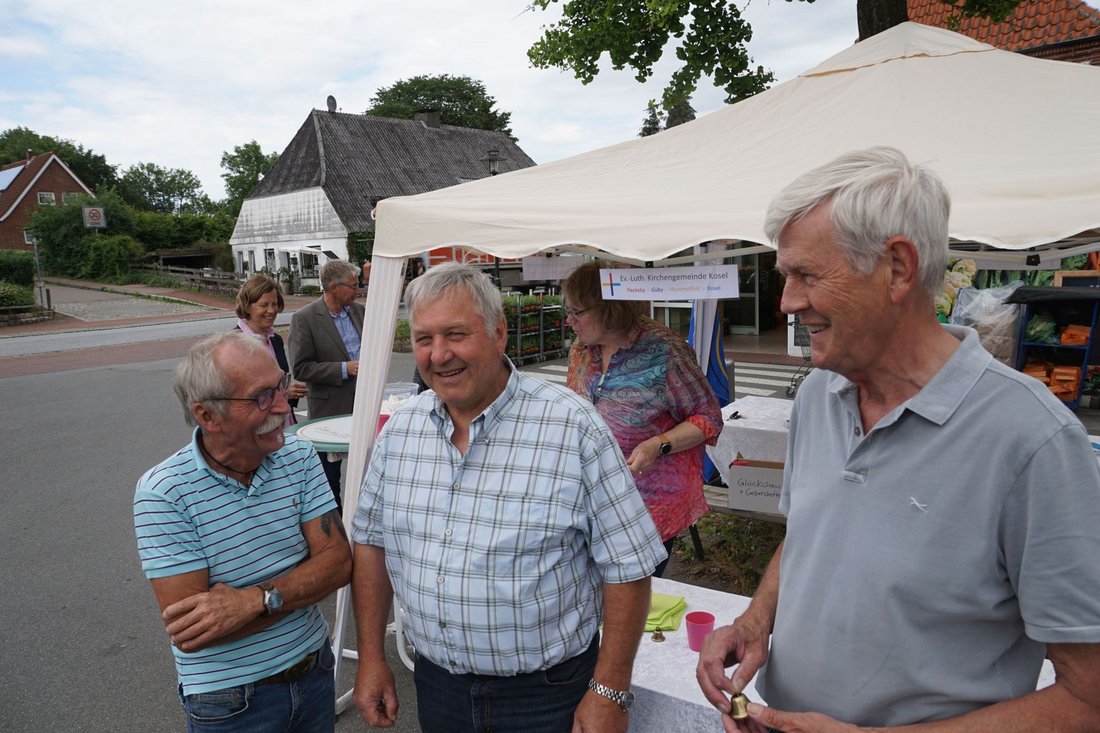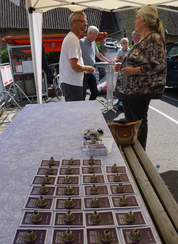In seine pröpstliche Sprechstunde kam diese Woche zwar niemand, „das ist ziemlich normal“, sagt Funck. Aber heute, am Pavillion vor dem Supermarkt, nutzt im Laufe der Stunde doch eine Handvoll Leute die Gelegenheit und schnackt mit ihm. Auch Göntje Timme aus Fleckeby tauscht drei, vier freundliche Worte mit Propst und Pastorin. Und in ihrem Bastkorb liegt nun, zwischen Kaffee, einer Rolle Gelber Säcke undder Zeitschrift fürs Wochenende, auch ein Glöckchen.