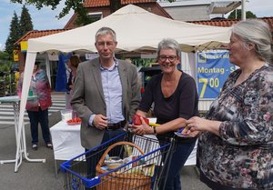 Funck saß aber auch mit im Kirchengemeinderat und auf dem Fußboden des örtlichen Kindergartens, er hat den Konfirmationsunterricht besucht und den Seniorennachmittag. Er hat gesprochen mit der Grundschulleiterin, den Bürgermeistern der vier politischen Gemeinden und den Verbänden und Vereinen: „Da waren gut 30 Leute im Raum“, sagt Funck, „das hat es vorher nicht gegeben, die wollten solch ein Treffen immer schon mal machen und haben jetzt die Visitation dafür zum Anlass genommen – das ist doch wunderbar!“ Funck ist es ein großes Anliegen, „dass wir als Kirche im Dialog mit den anderen Akteuren zum Dorfleben beitragen, um gemeinsam Lösungen zu finden für Themen wie Mobilität, Altern auf dem Land oder ehrenamtliches Engagement.“ Und eine Aktion wie die heute vor dem Supermarkt sei daher beispielhaft.