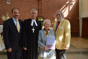 Auch in ihrem Beruf als Lehrerin vermittelte sie jungen Menschen den christlichen Glauben im Religionsunterricht und sie bildete Lehrkräfte im Fach Religion aus. „Ich wollte diese Herausforderung annehmen“, sagte Hannelore Hähne in ihrer Dankesrede. Diese Beharrlichkeit zeichne sie aus, sagte Laudator Pastor Henning Halver. Hannelore Hähne habe sich ihre kindliche Neugier bewahrt, stets Glaube und Lehre hinterfragt und Antworten gesucht. „Das alles hast Du, liebe Hannelore, mit Ausdauer, mit Gründlichkeit, mit eigenem Studieren und fundiert-kenntnisreichem Weitersagen mit anderen geteilt, anderen, Kleinen und Großen, mitgeteilt“, sagte Henning Halver. „Viele, viele Menschen haben Dir auf dem je eigenen Glaubensweg viele Impulse zu verdanken. Die Beharrlichkeit, diesen Deinen Weg zu gehen, kommt aus Deinem immer noch fragenden Kopf und Herzen. Möge Gott Dir Kopf und Herz, Leib und Seele bewahren.“
