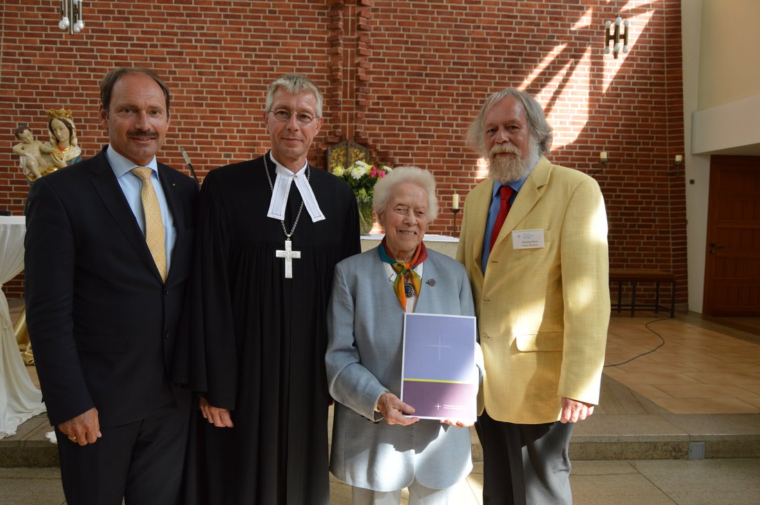 Theologische Bildung von Kindern und Erwachsenen ist seit Jahrzehnten Hannelore Hähnes Anliegen. Gestern (Dienstag, 13. Juni) wurde die 88 Jahre alte Rendsburgerin dafür mit dem Ansgarkreuz der Evangelisch-Lutherischen Kirche in Norddeutschland ausgezeichnet. Propst Sönke Funck überreichte ihr das Dankzeichen im Rahmen der 60-Jahr-Feier der Evangelischen Familienbildungsstätte (FBS) Rendsburg-Eckernförde in der katholischen Kirche St. Michael in Rendsburg.