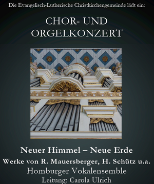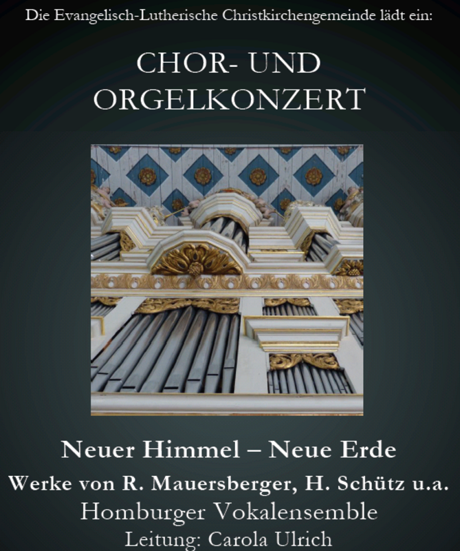 Das von Carola Ulrich geleitete Homburger Vokalensemble wurde im Herbst 1996 als überregionaler Chor des Protestantischen Kirchenbezirkes Homburg/Saar gegründet. Zahlreiche Konzertreisen führten den Chor nach Nord- und Mitteldeutschland sowie nach Österreich. Regelmäßig wirkt das Homburger Vokalensemble bei Landeskirchenmusiktagen und Produktionen für den Saarländischen Rundfunk mit. An der großen Arp-Schnitger-Schuke-Orgel der Christkirche wird Stefan Ulrich, Kantor und Organist an der Stadtkirche Homburg, zu hören sein.