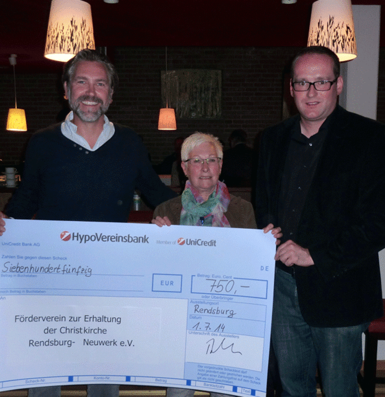 Die Neuwerker Werbegemeinschaft unterstützt die Sanierung der Christkirche. Die Geschäftsleute im Rendsburger Barockstadtteil hatten im Rahmen der Veranstaltung „Neuwerker Sommer“ am 21. Juni um Spenden für die Erhaltung der Christkirche gebeten. Sammeldosen in den Geschäften sowie der Erlös von Tombola und Glücksrad ergaben insgesamt eine Summe von 750,00 Euro, die Jörg Herzog stellvertretend für die Gewerbetreibenden an Gudrun Lamich, Vorsitzende des Fördervereins zur Erhaltung der Christkirche, und Pastor Dr. Stefan Holtmann übergab. „Wir freuen uns, dass wir mit dem bunten und lebendigen Sommerfest in der Königstraße zugleich einen Beitrag zur Erhaltung der Christkirche leisten können“, so Herzog. Werbung für den besonderen Stadtteil und für die Christkirche, die mittlerweile als „national wertvolles Kulturdenkmal“ anerkannt sei, würden wunderbar zusammenpassen, so Herzog weiter. Gudrun Lamich dankte den Mitgliedern der Werbegemeinschaft für die Unterstützung: „Ich freue mich sehr über diese Unterstützung aus dem Stadtteil. Ich bin mir sicher, dass wir gemeinsam dafür sorgen können, dass die Christkirche erhalten bleibt.“ Pastor Holtmann kündigte an, dass die Spenden, passend zur Veranstaltung in der Königstraße, in die Sanierung des Dachstuhls über dem Königstuhl fließen würden.
