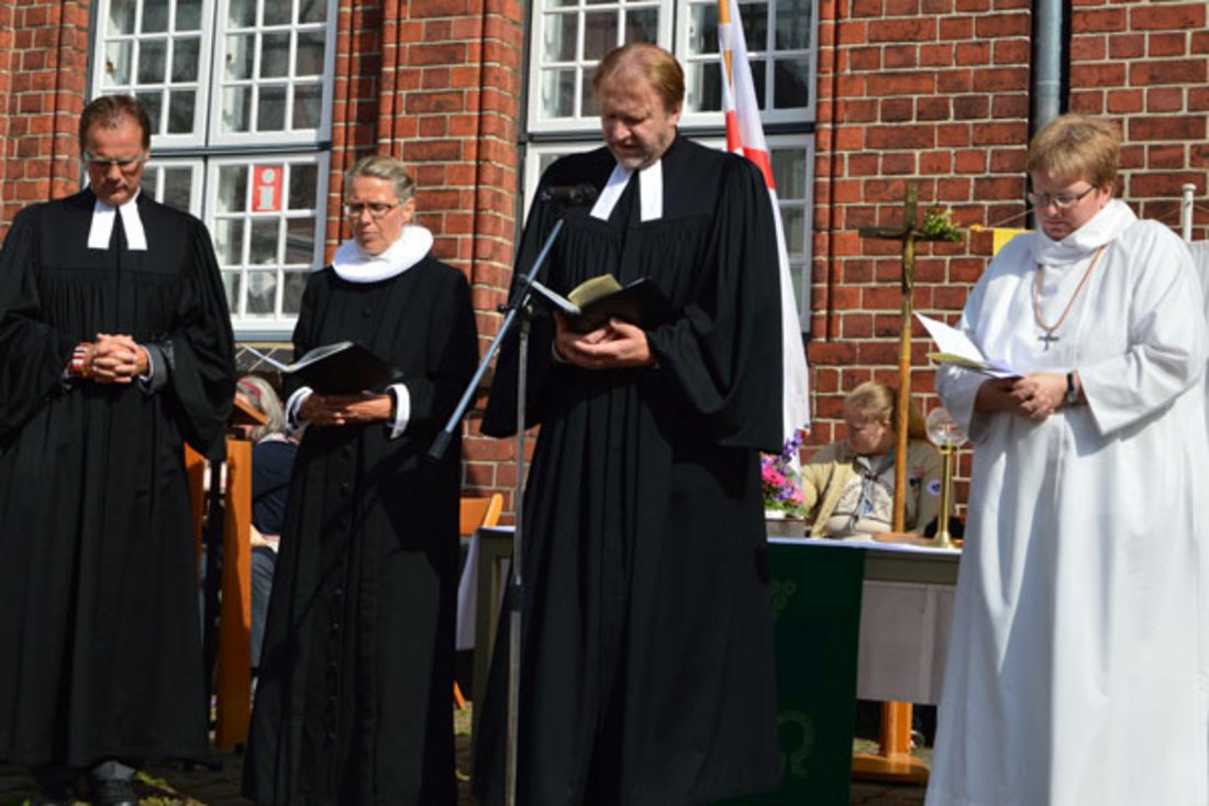 Der Gottesdienst, der mit einer Eröffnung und Begrüßung in der katholischen Kirche St. Martin begonnen hatte, folgte eine Prozession zum Altstädter Markt. Von dort wurde der Gottesdienst unter freiem Himmel fortgesetzt. Etwa 100 Personen besuchten diesen Ökumenischen Gottesdienst zum Rendsburger Herbst an diesem Sonntag, den 30. August.