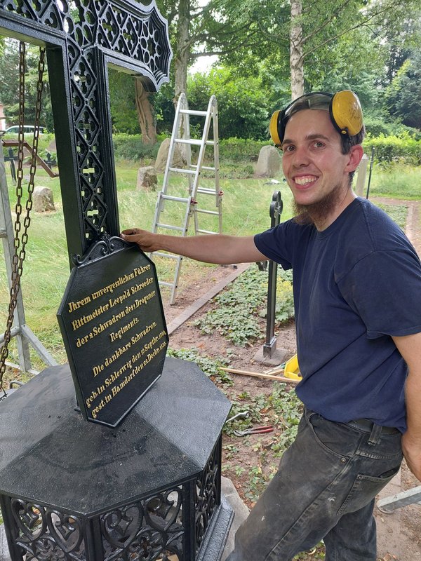 Der Freundeskreis Garnisonfriedhof besteht aus engagierten Menschen, die sich seit 2021 regelmäßig auf der Anlage treffen, sich um Grünpflegearbeiten und die Instandhaltung der Grabmale kümmert. Zuletzt war unter anderem das Grabkreuz von Premierleutnant Bonnivet restauriert worden. Außerdem wurde das Steingrabmal von Leo Hold freigelegt und gereinigt. In diesem Jahr plant die Kirchengemeinde noch die Restaurierung von vier weiteren Grabdenkmälern durch Restauratorin Stephanie Silligmann aus Brunsbek sowie der Grabplatte für die Opfer des Krieges 1870/71 durch Restaurator Kurt Lange.