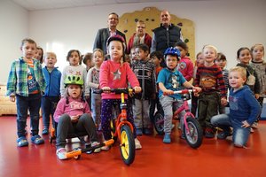 „Wir haben ein Spendenbudget, das wir für diese Zwecke nutzen können“, sagt Benz. Laufräder und Scooter helfen den Kindern, die Motorik für das Fahrradfahren zu entwickeln. Und das ist in den Augen von Dietmar Benz heute besonders wichtig. „Viele Kinder können nicht Fahrrad fahren“, sagt er. „Das merken wir oft in der vierten Klasse bei der Radfahrprüfung.“ Damit die Kinder der Kita St. Jürgen später nicht durch die Prüfung fallen, sollen sie jetzt spielerisch ihr Gleichgewicht schulen. Denn Laufräder und Scooter sind Spielgeräte, keine Fortbewegungsmittel.