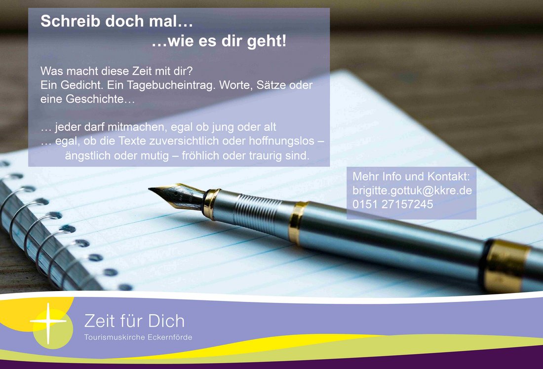 Eckernförde - Tourismuspastorin Brigitte Gottuk ruft zu einer Aktion unter dem Motto "schreib doch mal, wie es Dir geht" auf. Sie erhofft sich Texte darüber, was die aktuelle Situation mit den Menschen macht und denkt an ein Gedicht, einen Tagebucheintrag. Worte, Sätze oder eine Geschichte. Mitmachen kann jeder, ob jung oder alt. Egal ob die Texte zuversichtlich oder hoffnungslos, ängstlich oder mutig, fröhlich oder traurig sind.