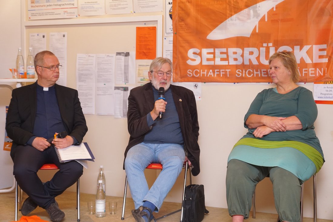 Ein Ziel der „Seetember“-Aktion ist laut Organisator Wiegand, dass sich Rendsburg zum „Sicheren Hafen“ erklären möge. Eine entsprechende Initiative hat die Rendsburger SPD für die kommende Ratssitzung am 26. September gestartet. Die Aussichten seien nicht besonders gut, berichtet Andreas Marx aus dem Publikum: „So wie es aussieht, wird es keine Mehrheit dafür im Rendsburger Rat geben“. Das bedauerten die Podiumsgäste ausdrücklich. „Die Auswirkungen für die einzelne Kommune sind sehr gering“, so Schmidt. Kleinewiese machte deutlich, dass es eigentlich kaum eine Alternative gebe: „Die Erklärung zum ‚Sicheren Hafen‘ ist nichts anderes als ein Beleg für unsere Haltung und ein deutliches Zeichen dafür, dass wir unsere christlichen Werte auch leben“. Ullrich betonte den zweideutigen Aspekt eines Hafens: „In einem Hafen kann ich nicht nur anlegen, ich kann von dort auch ablegen. Und genau das wollen die meisten dieser Menschen mehr als alles andere: Wieder nach Hause, in ein sicheres Zuhause“.