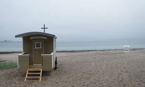 Die beiden Frauen sind zur neuen Schäferwagenkirche des evangelisch-lutherischen Kirchenkreises Rendsburg-Eckernförde mit dem Rad gekommen. Nun pladdert es richtig, fast schleswig-holsteinisch, und diese Kirche tut das, was sie in einem solchen Fall tun soll: einen Schutzraum bieten, Menschen ins Gespräch miteinander bringen, anregen zum Plaudern oder Schweigen mit dem Blick aufs Meer – auch wenn sich die Bucht gerade mehr ahnen lässt als wirklich sehen. Eine mobile Kirche direkt am Strand: Das ist bislang einzigartig an Nord- und Ostsee.