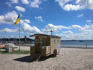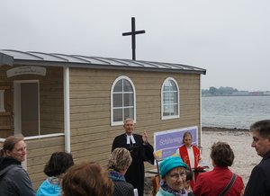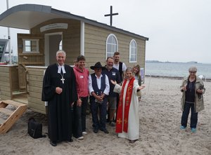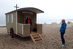 Tourismuspastorin Brigitte Gottuk und Propst Sönke Funck rufen zur Einweihung der Schäferwagenkirche – lautstark mit einer Messingglocke, die die evangelische Gemeinschaft in der Nordkirche just für derlei Anlässe geschenkt hat, um sich Gehör am Strand zu verschaffen. „Diese mobile Kirche“, erklärt Funck den nun etwa 50 Versammelten, „soll ein Stützpunkt für die Arbeit der Tourismuskirche werden. Wir Menschen sind ja gerade im Urlaub ein wenig freier vom alltäglichen Kleinklein und kommen so auch auf andere Gedanken, was uns bewegt und wie wir leben wollen. Also müssen wir als Kirche dorthin gehen, wo im Sommer alle sind: an den Strand.“ Die Schäferwagenkirche sei für alle ein weithin sichtbares Zeichen und Angebot „und ein sichtbarer Ausgangs- und Sammelpunkt für alle Aktivitäten unserer Tourismuspastorin Brigitte Gottuk und ihrer Teams hier am Strand. Eine sichtbare Kirche - auch wenn mal gar nichts los ist. Und es ist wunderbar, dass dieses Projekt dank der Unterstützung vieler Spender und Stiftungen nun noch vor den Sommerferien beginnt!“