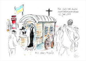 Ossenberg-Engels wird an diesem Abend trocken nach Hause gelangen. Und gleich am nächsten Morgen erneut an den Strand fahren und ein Schild „Ich habe Zeit“ an die neue kleine Kirche hängen. Die Sonne wird dann scheinen und die erste Besucherin eine Urlauberin sein. Sie kommt vom Bodensee, geheiratet hat sie hier in Eckernförde. Und die Schäferwagenkirchenhelferin wird feststellen: „Wir brauchen dringend ein Gästebuch – für genau diese Geschichten.“