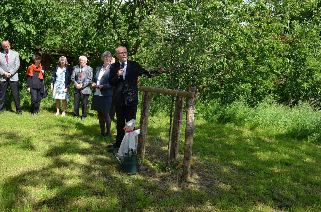Im Anschluss an den Gottesdienst eröffnete der Bischof den „Lebensgarten“. Er sei ein Ort, „an dem Menschen Bäume pflanzen können als Erinnerung an besondere Momente in ihrem Leben. Ein sichtbares Zeichen, das Gott im Leben mit seinem Anfang und Ende an unserer Seite geht“, sagte er. Die ersten zwei Obstbäume haben auch schon ihren Platz auf der Wiese gefunden: Ein Apfelbaum hatte der Kirchengemeinderat in Erinnerung an das Reformationsjubiläum und an das Kirchjubiläum gepflanzt, einen zweiten die Gemeinde Thumby. Jeder Baum soll daran erinnern, dass Gott seine Welt nicht verloren gibt.