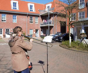 Rendsburg - Vor dem Hospizhaus Porsefeld fährt ein türkises Elektroauto vor, eine Frau steigt aus, baut einen Notenständer auf, packt die Posaune aus – und spielt. Ringsum gehen Fenster, Eingangs-, Balkon- und Terrassentüren auf, vorwiegend ältere Menschen schauen heraus, klatschen, singen mit.