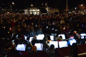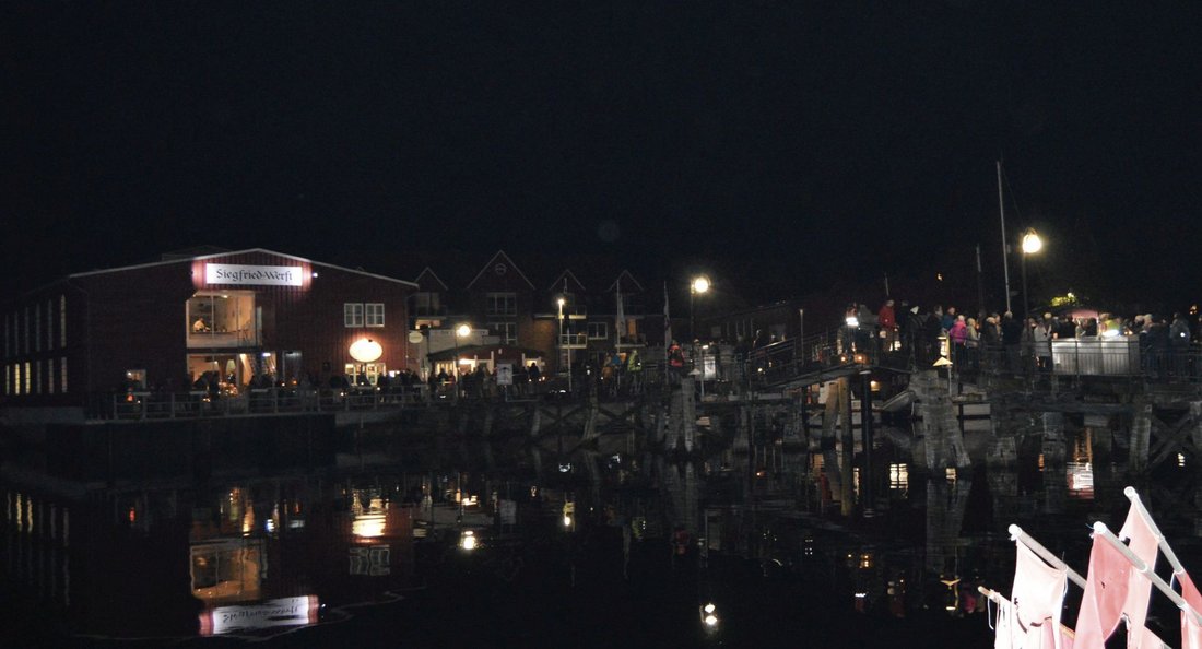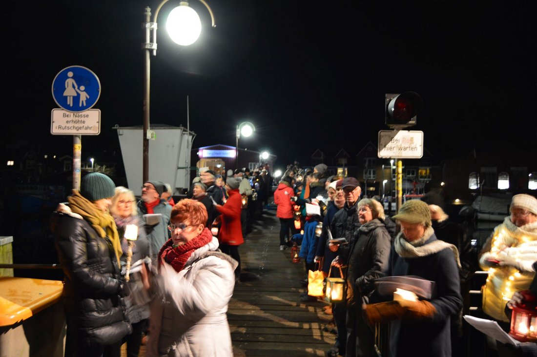 Der Krankenwagen teilt kurz die Menge, Carola L‘hoest spricht ihren Dank aus und damit das, was wohl die meisten auf dem Platz denken. Dann fordert Borbys Pastor Rainer Kluß dazu auf, das Zentrum des Geschehens zu verlagern: auf die Holzbrücke und beide Uferseiten. Als würde er sich solidarisch erklären, zeigt sich zum nun gesungenen Abendlied „Der Mond ist aufgegangen“ ebenjener als Sichel über dem Hafenbecken. Und auch das folgende dänische „Du, som har tændt millioner af stjerner“ passt in Bild und Klang: „Du, der lässt leuchten Millionen von Sternen“. Die Brücke ist voller Menschen, die Uferseiten ebenfalls, als Pastor Kluß darum bittet, nun die Laternen deutlich sichtbar zu halten „und kurz darüber nachzudenken: Was kann ich für den Zusammenhalt tun?“ Und er bittet um zwei Minuten Stille.